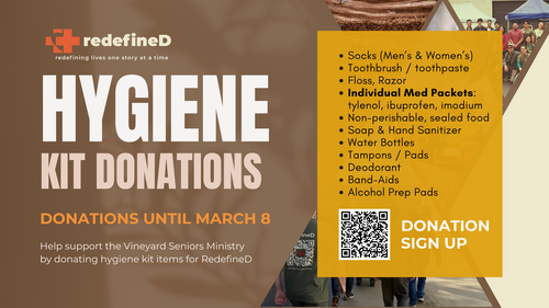 Vineyard seniors will be packing the items into hygiene kits to donate to RedefineD Medical Volunteer Non-Profit, which hosts monthly clinics and street medicine for the unhoused community of Pomona.
