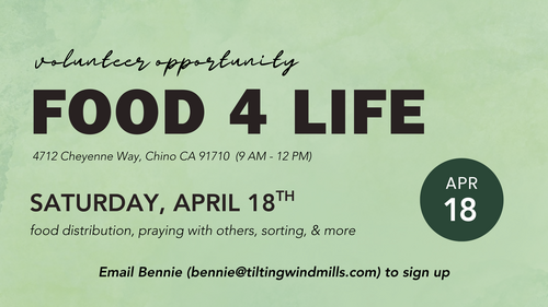 Join us in volunteering to help the Food For Life ministry here in Chino at 4712 Cheyenne Way, Chino CA 91710. We will be serving on Saturday, April 18th from 9 AM to 12 PM (check in time is at 8:45 AM). Types of duties include distribution of food, walking people’s carts out to their car, praying with/for them if needed, returning carts for reuse and possibly some sorting. Wear a Lifesong t-shirt and close toe shoes.